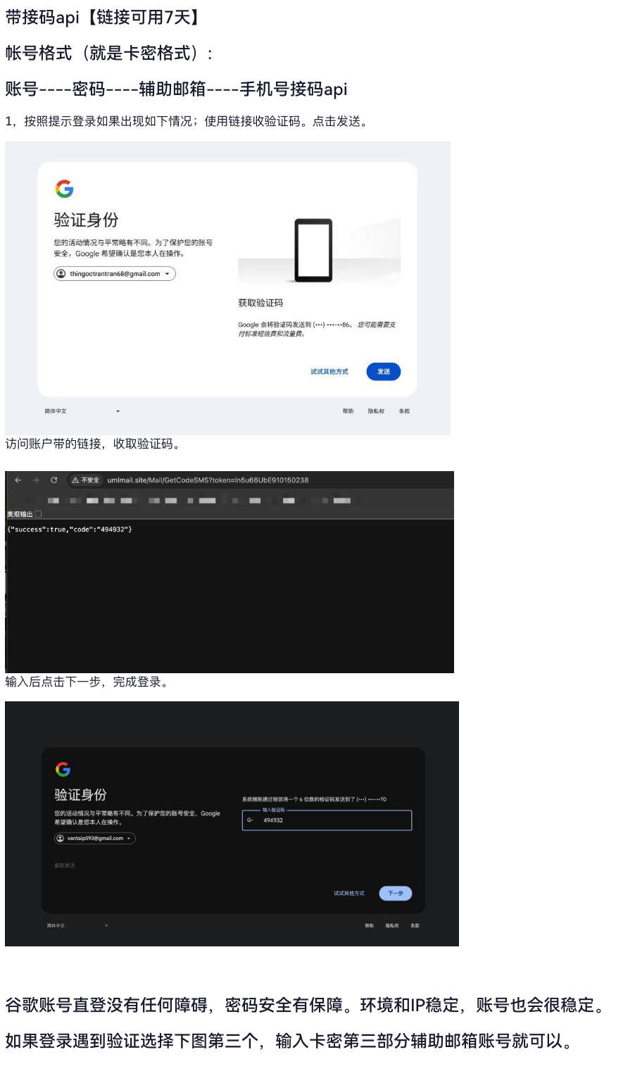 账户格式:账户----密码----辅助邮箱----2fa----手机验证码解码api地址